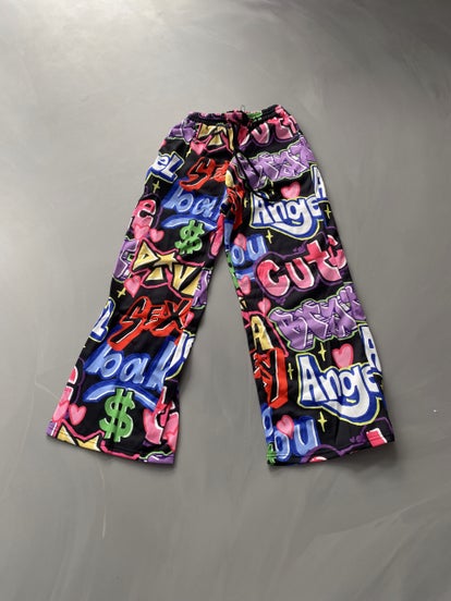 Stoere zwarte broek met tekst in diverse kleuren in diverse maten. verkoop in partij van 14 stuks. Geen losse verkoop.